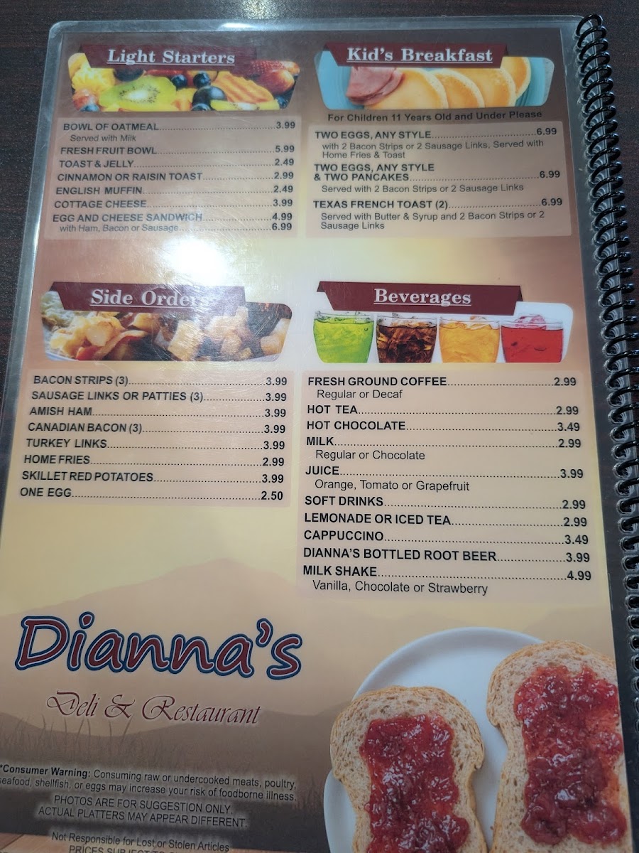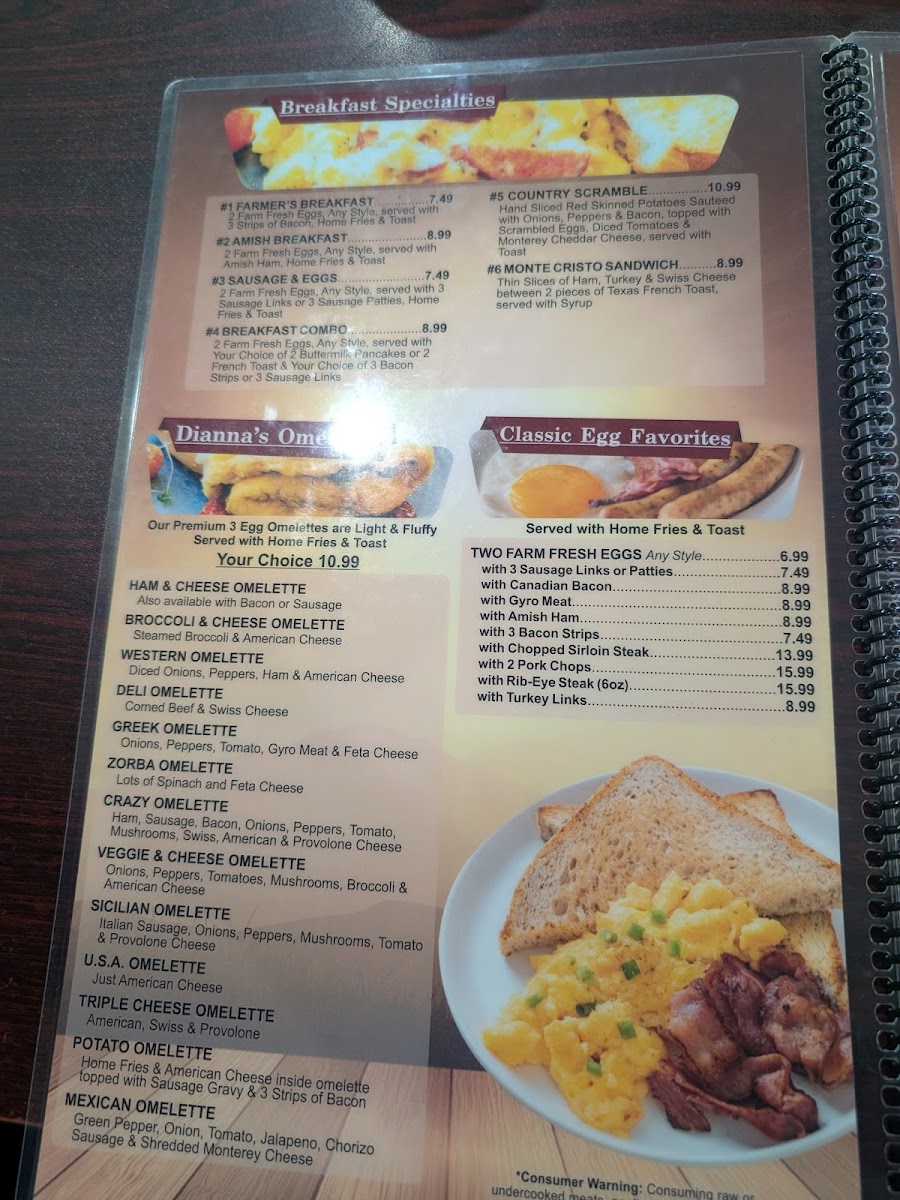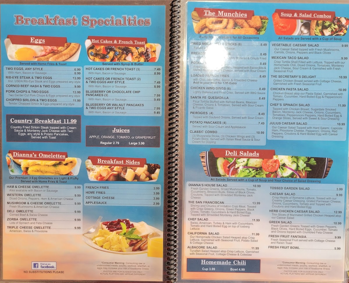 The menu at Dianna's Deli & Restaurant in Sandusky, OH offers a diverse selection of meals suitable for breakfast, lunch, and casual dining throughout the day. The menu is organized into several key sections to accommodate various tastes and dining needs.